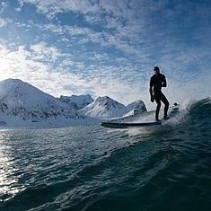 Una persona haciendo surf en el Círculo Polar Ártico.