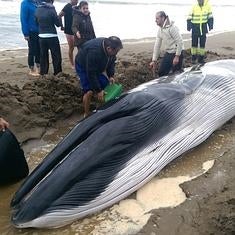 El pasado miércoles varó en la playa de Punta del Moral de Ayamonte una cría de ballena rorcual común, de 8 metros de longitud y unos 3.000 kilos de peso, que falleció después de que estuvieran hidratándola durante 11 horas al chocar contra el espigón al tratar de salir al mar.