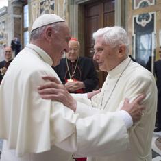 Saludo entre Francisco (i) y su antecesor como Papa, Benedicto XVI.