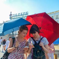 Dos jugadoras utilizan Pokémon Go en la Puerta del Sol.