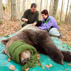 Un cazador y una veterinaria ponen un tranquilizante a un oso en los bosques de Masun, en Eslovenia.