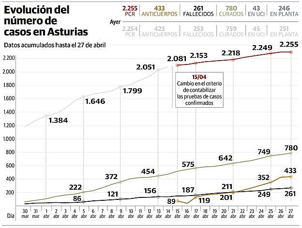 Asturias registró ayer solo un nuevo positivo de COVID-19 mediante la prueba PCR, arrojando un acumulado 2.255 casos. Los datos facilitados por la Consejería de Salud diferencian desde el fin de semana aquellos confirmados mediante este criterio y los que se suman por test anticuerpos. De estos últimos se han contabilizado diez más hasta un total de 433. Esta desagregación de datos está en consonancia con el cambio de criterio que el Ministerio de Sanidad viene aplicando desde el 15 de abril. La autoridad sanitaria lo justificó porque el número de personas enfermas solo puede recogerse de los datos de prueba PCR, ya que los test serológicos no determinan si el virus está activo, sino si la persona ha creado anticuerpos al Covid-19. Es decir, puede ser asintomática o pudo haber estado infectada hace tiempo. El consejero de Salud, Pablo Fernández destacó ayer que Asturias es «la segunda comunidad autónoma en número de pruebas diagnósticas por PCR por cada mil habitantes». En el caso de test anticuerpos, ocupa la novena posición.