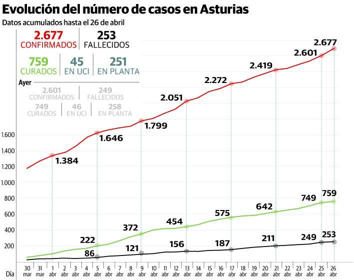 Jornada tras jornada, sigue habiendo que lamentar nuevos fallecimientos, aunque los números de ayer son los menos dramáticos de la última semana. Cuatro decesos, que ya arrojan un total de 253. Dos de ellos tuvieron lugar en la red geriátrica asturiana, que sí parece vislumbrar cierta luz en el horizonte. La cifra de muertos se ha desplomado y 26 residentes se han recuperado. Uno de los decesos corresponde al CPR Naranco de Oviedo, donde ya perdieron la vida cinco residentes. El otro fallecimiento está vinculado a la residencia La Atalaya de Gijón, que ya suma seis. Desde el inicio de la crisis sanitaria 610 usuarios de la red geriátrica dieron positivo en COVID-19, de los que permanecen activos 202. Entre los centros más golpeados en la actualidad por la pandemia se encuentra la residencia Nuestra Señora de Covadonga de Siero, con 44 residentes activos. Le sigue el CPR Pravia, con 29 afectados, y 20 en la residencia Plaza Real de Gijón.