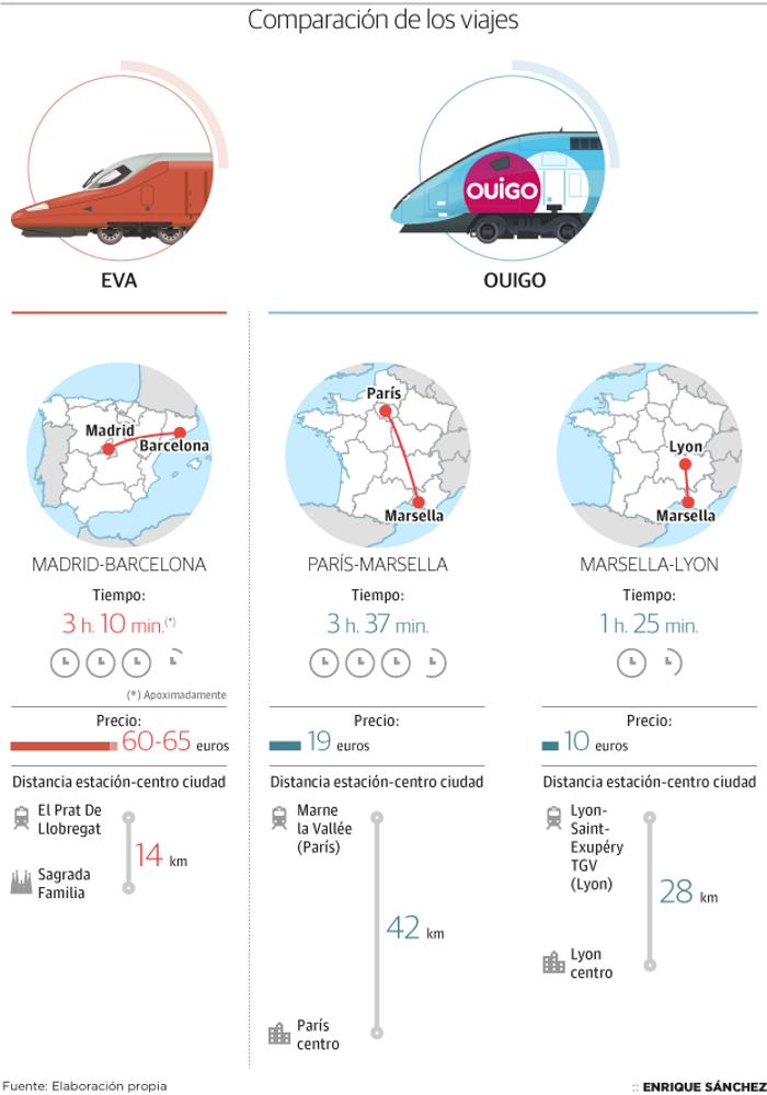 Nunca está de más mirar al país vecino. Francia dispone de un servicio similar al que ofertará Renfe. Conocido como 'Ouigo', el país galo dispone un servicio de tren de alta velocidad 'low cost' desde el año 2013. Ofrece billetes desde diez euros a 17 ciudades del país, donde es posible viajar por un módico precio desde París a Lyon o Marsella. Un ejemplo: viajar del centro de Marsella al aeropuerto de Lyon -más de 300 kms- le podría costar este sábado con 'Ouigo' diez euros. Un precio infinitamente inferior al que tendrán que pagar los españoles por utilizar el servicio EVA.