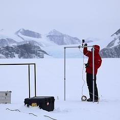 Un científico instala un instrumento de medición de la radiación solar en el campamento Glaciar Union, a 1000 kilómetros del Polo Sur.