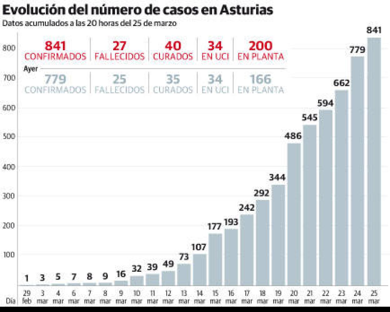 Aunque no al ritmo previsto por los expertos, que predecían que el pico epidémico se alcanzaría ayer, el número de casos continúa creciendo. Tras confirmar este miércoles 62 positivos, son ya 841 los afectados, 774 activos. También son más cada día los pacientes que requieren atención hospitalaria, 234 según los últimos datos confirmados. De estos, 220 permanecen en planta y 34 en la Unidad de Cuidados Intensivos. La cifra más alentadora es un día más la de las curaciones, que son ya 40 desde el principio de la epidemia.