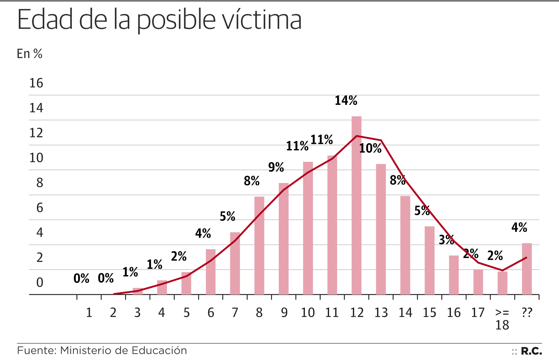 El acoso escolar es un mal que se sufre ya desde los primeros cursos de Primaria, con un número significativo de denuncias a los 6, 7 y 8 años, pero que acumula casi la mitad de las víctimas (el 46%) entre los 10 y los 13 años, con un pico máximo del 14% a los 12 años. Por contra, el descenso de denuncias es drástico con la entrada en la edad juvenil. No hay diferencias significativas entre hombres y mujeres.