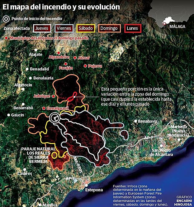 El fuego avanzó primero hacia la costa empujado por rachas de poniente de hasta 45 kilómetros por hora y llegó a la autopista de peaje a la altura de Estepona, donde los bomberos lograron contenerlo a apenas 20 metros de una gasolinera. Sin embargo, dos días después volvió sobre sus pasos ayudado por el viento de levante y enfiló de nuevo la sierra con llamas de hasta 20 metros de altura.