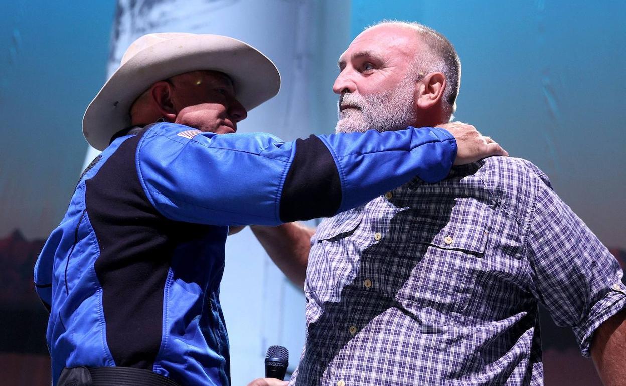 «El mejor día», dijo Jeff Bezos a las 15.23 de ayer con la cápsula en la que viajó al espacio ya posada en tierra. La nave con el propietario de Amazon, su hermano Mark, la pionera de la aviación Wally Funk y el joven Oliver Daemen acababa de aterrizar en el desierto de Texas diez minutos y diez segundos después de haber despegado sobre un cohete New Shepard de Blue Origin. Los cuatro astronautas habían atravesado el límite entre la atmósfera terrestre y el espacio, situado a unos 100 kilómetros de altura, y habían experimentado la microgravedad durante tres minutos. Y no solo eso, sino que además Bezos lo celebró realizando dos regalos muy especiales. Al final de la rueda de prensa posterior al vuelo, anunció la donación de 100 millones de dólares, unos 85 millones de euros, a la asociación humanitaria creada por el chef asturiano José Andrés. «José, por favor sube», pidió el magnate. Los dos se abrazaron en el escenario y el cocinero agradeció, emocionado, la donación a World Central Kitchen. «Este premio es el inicio de un nuevo capítulo para nosotros», dijo el último Princesa de Asturias de la Concordia, para quien «ahora es el momento de pensar a lo grande». Y añadió el concinero de Mieres: «World Central Kitchen, mi oenegé, surgió de una idea muy simple pero muy poderosa. La comida puede cambiar el mundo. Y un plato de comida es un plato de esperanza». Bezos donó otros 85 millones al activista por los derechos civiles Van Jones. Y así fue como José Andrés se convirtio en coprotagonista de una de las grandes noticias de ayer a nivel planetario.