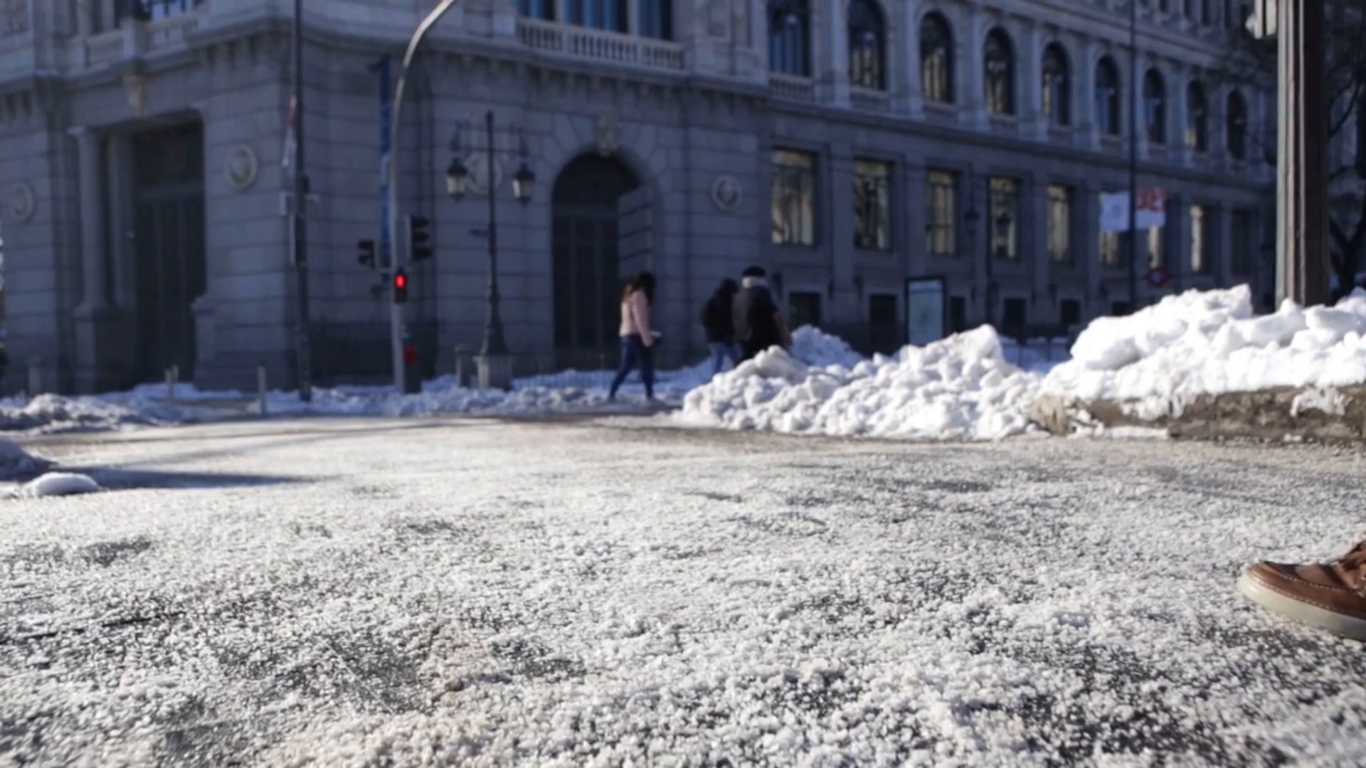 Placas de hielo, calles sin apenas coches y quitanieves en las principales nudos de la ciudad es la estampa que deja la borrasca Filomena en la capital.