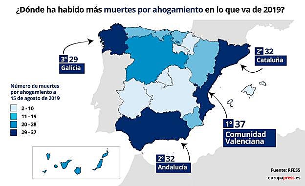 Nueve comunidades autónomas han disminuido o igualado el número de fallecimientos por ahogamiento respecto a la misma fecha del año anterior, entre ellas Canarias con cuatro fallecidos menos (26 en total), Baleares con once menos (nueve en total) y Madrid con dos menos (cuatro fallecidos en total). Otros diez territorios autonómicos españoles han aumentado la cifra de fallecidos por ahogamiento, entre ellos la Comunidad Valenciana, que ha pasado de 22 a 37; Cataluña, que ha registrado 32 frente a los 25 señalados anteriormente, y Aragón, que ha aumentado la cifra de siete a once fallecidos.