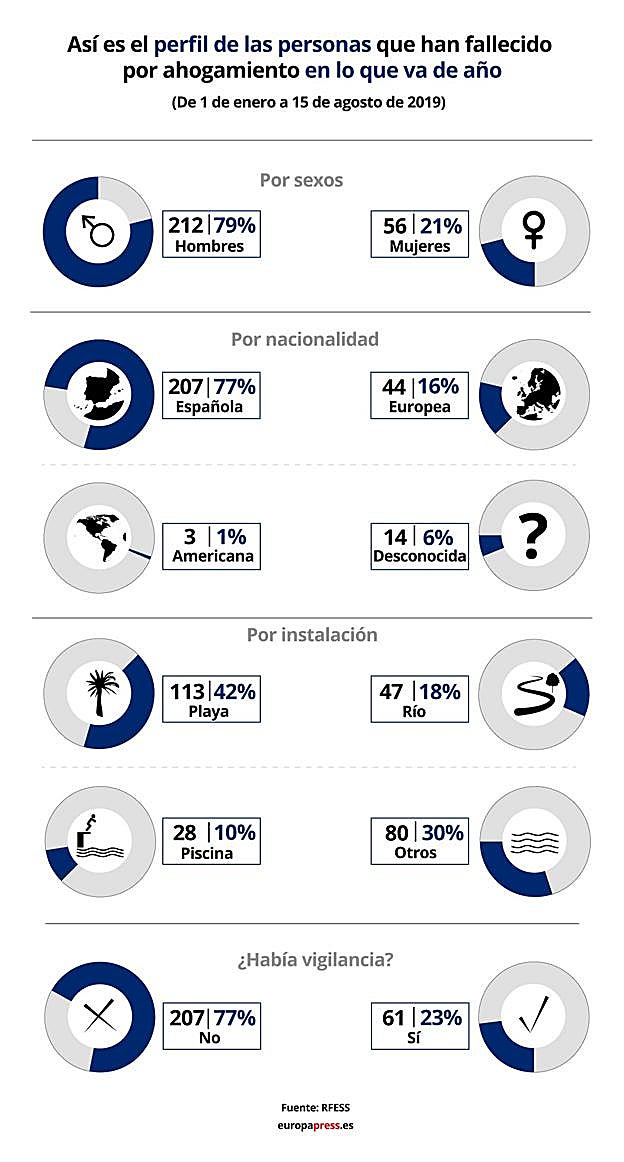 Las muertes por ahogamiento en los espacios acuáticos españoles han aumentado un 20,72% entre el 1 de enero y el 15 de agosto de este año en relación con el mismo periodo de 2018. Se han registrado 46 fallecimientos más, alcanzando la cifra de 268 muertos en lo que va de año, según el Informe Nacional de Ahogamientos de la Real Federación Española de Salvamento y Socorrismo (RFESS).