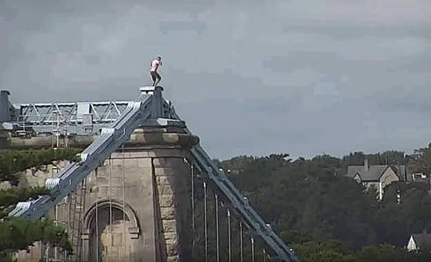 A Craig Lee Jones, de 31 años, no le sirvieron más alcohol en un bar y el hombre decidió subirse a lo más alto del puente colgante de Menai, entre la isla de Anglesey y Gales.