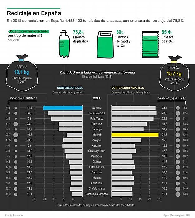 Cada español depositó el año pasado en el contenedor amarillo 15,7 kilos de envases de plástico, latas y brick, casi dos kilos más que en 2017, e introdujo 18,1 kilos de papel y cartón en el contenedor azul, dos kilos más que un año antes. Este esfuerzo ha hecho que las tasas de reciclaje de todos los tipos de materiales se hayan disparado, pero destaca la de botellas y envases de plástico que, con un 75,8% de reutilización, ha mejorado seis puntos en solo doce meses. La tasa de reciclado del papel y cartón es ya del 80%, la del metal, del 85,4%, y la de la madera, del 63,5%.