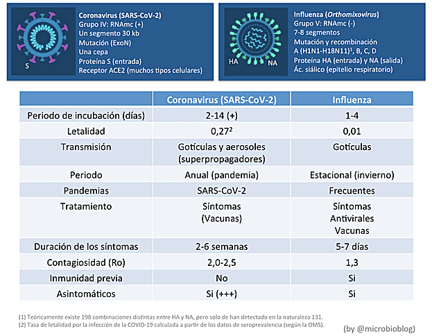Es muy probable que el menor periodo de incubación de la gripe, la existencia de inmunidad previa, la intensa campaña de vacunación de este año, las medidas de confinamiento, disminución de viajes, uso de mascarilla, higiene y distanciamiento social hayan tenido un mayor efecto en disminuir la transmisión de este virus. Por el contrario, en la transmisión del coronavirus además influyen mucho más el efecto de los aerosoles, el papel de los superpropagadores y los asintomáticos.