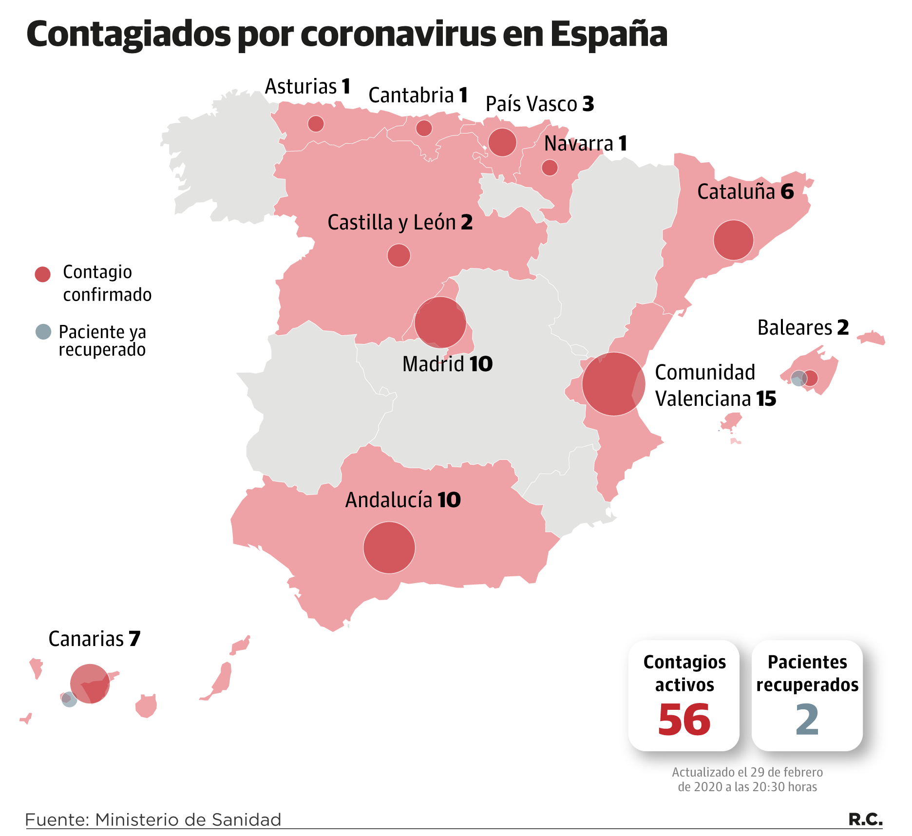 El coronavirus se extiende ya por once comunidades autónomas, al sumarse tres de ellas a la lista, y este sábado registraron 18 nuevos positivos: cinco en Valencia, dos en Cataluña, tres en Madrid, dos en Andalucía, uno en Baleares, uno en Canarias, uno en Navarra, uno en Asturias, uno en Euskadi y uno en Cantabria. Todos ellos están relacionados con casos ya conocidos o con el brote aparecido hace una semana en Italia, por lo que no se trata de infecciones de nuevos focos.