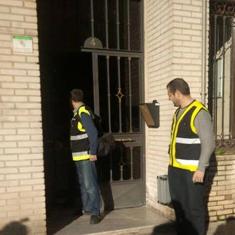 Agentes de la Policía Científica en el portal del edificio donde han ocurrido los hechos.