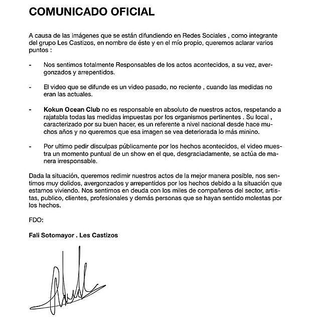 Les Castizos ha mandado un comunicado ayer sábado a raíz de la polémica que ha suscitado la difusión del vídeo, que acumula decenas de miles de reproducciones y comentarios negativos. En el escrito oficial, la promotora pide disculpas por lo ocurrido: «Nos sentimos totalmente responsables de los actos acontecidos, a su vez avergonzados y arrepentidos». De igual manera, desde Les Castizos restan responsabilidad a Kokun Ocean Club por cómo se gestionó la fiesta.