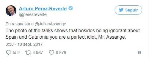 Un comentario que no ha gustado a Arturo Pérez-Reverte, que no ha dudado en contestarle a través de la misma red social, tachándole de «perfecto idiota» y acusándole de ser un ignorante sobre España y Cataluña.