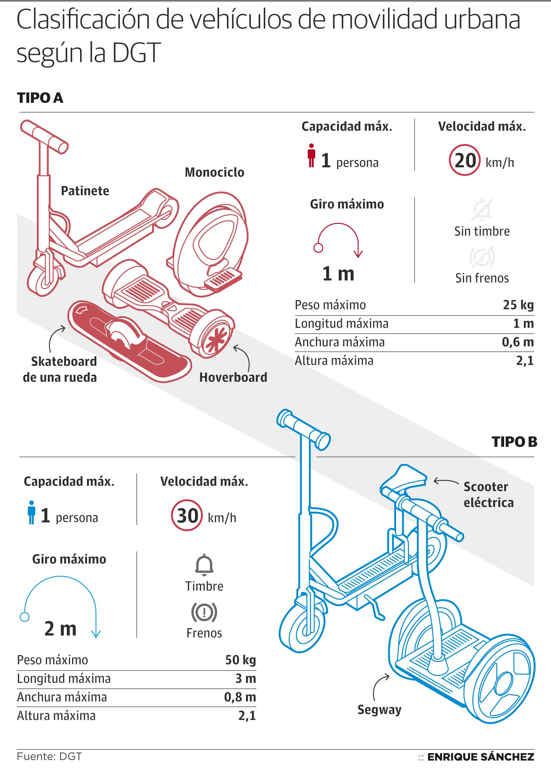 La Dirección General de Tráfico clasifica los vehículos de movilidad personal (VMP) en cinco categorías, según la instrucción emitida por el organismo en 2016. Dejando a un lado los vehículos eléctricos destinados al transporte de mercancías o personas, los patinetes, los monociclos, los hoverboards y los segways están recogidos en dos apartados.