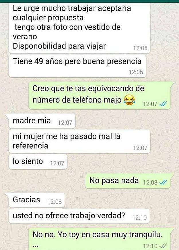 Hasta aquí todo más o menos correcto, si no fuera porque el lector de los mensajes nada tenía que ver con una plaza vacante de secretaria. Era un particular que trataba de pasar una tarde de sábado de lo más tranquila en su casa. Cuando le aclaró el mal entendido, el hombre siguió insistiendo y preguntó si el chico receptor no ofrecería algún trabajo; 'no, no, yo estoy muy tranquilu en mi casa'.