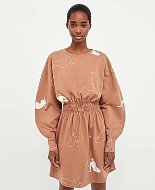 Entre las novedades de esta semana, Zara ha introducido en su colección de la tienda online un sorprendente vestido corto de manga abullonada en un precioso color salmón que es ideal para el buen tiempo que se aproxima. Además, uno de los detalles más bonitos del vestido no es solo el color, sino que incluye un estampado de mujeres desnudas en blanco que crean un increible contraste con el fondo.