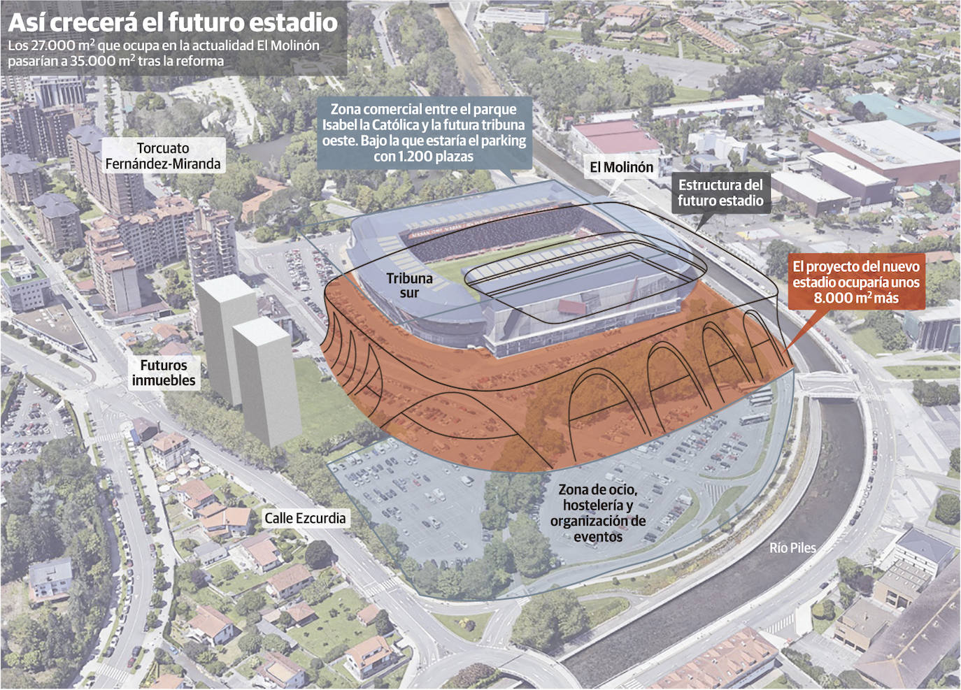 Sobre los bocetos del nuevo estadio, con enormes arcadas inspiradas, según el arquitecto, en los soportales de la plaza Mayor y en el mar Cantábrico, la alcaldesa reconoció que le gustó mucho «la estética» y que el edificio arquitectónicamente le impactó de dos maneras, una «positiva», por llamativo, y la otra porque es «muy blanco y eso hay que pensarlo dos veces». «Pero me parece un proyecto muy sugerente y las fuerzas y las ganas con las que lo defienden», añadió.