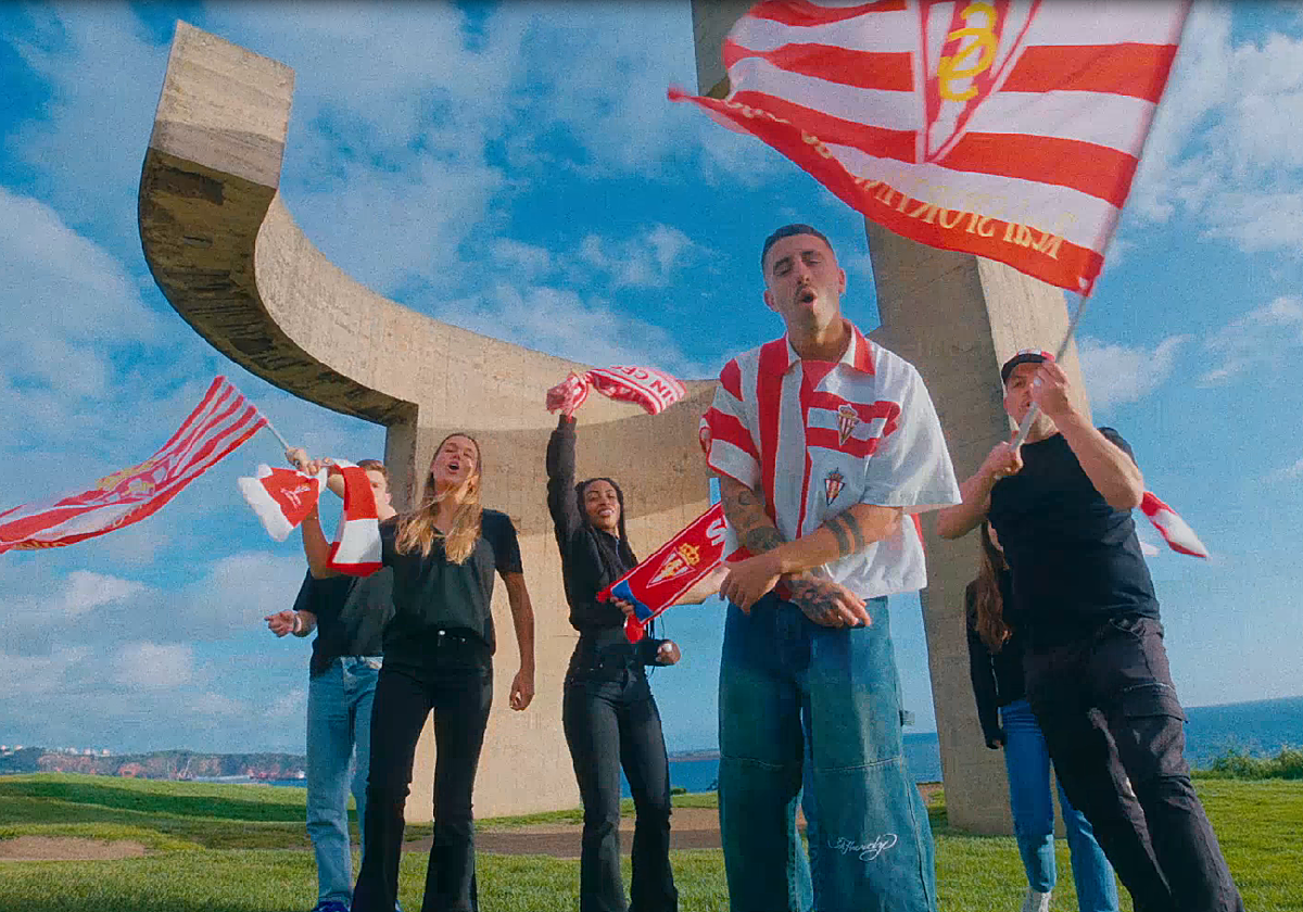 El cantante Enol, vestido de rojiblanco, se paseó días atrás por las calles de Gijón ofreciendo la posibilidad de escuchar en exclusiva un nuevo tema. No uno cualquiera, sino uno que presenta una estrecha vinculación con el Sporting. A todos los que se pusieron los auriculares les gustó. Su canción, una colaboración del club y la multinacional Warner, aún era por entonces un secreto.