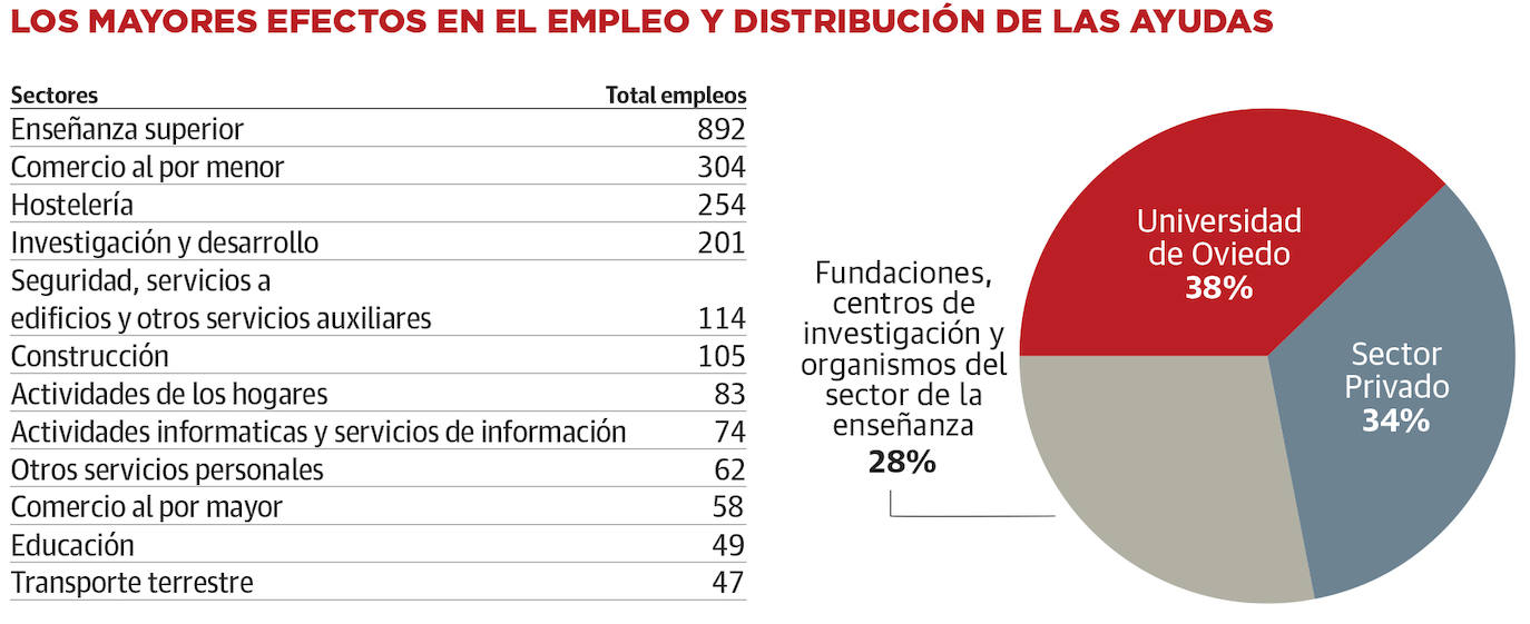 El informe, resaltó Carrascal, es pionero por partida doble. En primer lugar, porque «habitualmente no se tienen datos de todas las ayudas públicas de fomento de la innovación», que han sido facilitadas por la consejería del ramo, y luego porque alude a los efectos indirectos que produce en otros sectores que no recibieron ayudas en I+D+i. «Es algo que no había visto en ningún otro estudio», dijo el consejero Borja Sánchez, que estuvo en la presentación con el rector, Ignacio Villaverde y calificó los datos de «buenísimos». Así, el trabajo pone de manifiesto que la inversión realizada en I+D+i favorece indirectamente a otros «debido a la presencia de relaciones interindustriales», como son el comercio, la hostelería, la construcción o los servicios financieros. «Pensemos, por ejemplo, en una empresa que recibe una ayuda para comprar un ordenador y gracias a eso incrementa su producción. Necesitará contratar a servicios de transporte o material eléctrico. Además, da lugar a salarios, rentas, que revierten en consumo. Eso genera una ronda de efectos que la cuantía directa no es capaz de cuantificar, pero que permite ver cómo algo que entra en un sector acaba permeando a otros», dijo Esteban Fernández. A lo que André Carrascal añadía que «beneficia prácticamente a todo el tejido productivo asturiano».