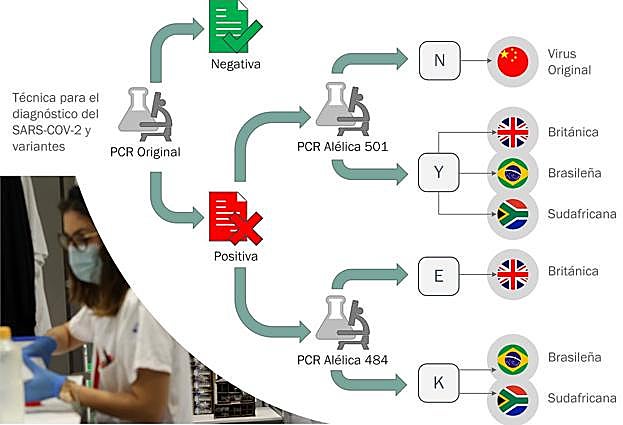 Recordamos que las tres variantes que más preocupan en estos momentos son la británica, que copa casi el 100% de los casos actuales en Asturias; la brasileña, con más de una docena de casos; y la sudafricana. Las tres se caracterizan porque tienen una mutación, la variante 501, con lo cual con la PCR alélica 501 podemos saber si tenemos una mutación del virus (Y). Pero no cuál de ellas es. El 'apellido' a nuestra variante se lo daremos con la otra PCR alélica, la 484, que distinguirá entre la cepa británica (E) o la brasileña/sudafricana (K). Actualmente, se está desarrollando otra PCR más, basada en la posición 417, que distinguirá entre las dos últimas.