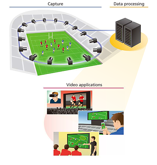 El sistema se compone de varias cámaras de alta resolución distribuidas alrededor del campo que están conectadas a una red y controladas mediante software para capturar las imágenes del partido simultáneamente desde varios puntos de vista. Posteriormente, la tecnología del procesamiento de imágenes procesa los vídeos como datos espaciales en 3D con alta resolución y los usuarios pueden mover libremente una cámara virtual alrededor del espacio 3D para ver las imágenes desde diferentes ángulos y puntos de vista.