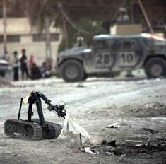 Un robot teledirigido examina una calle de Bagdad.