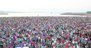 El arenal gijonés volvió a ser el escenario elegido para buscar el récord mundial de escanciado simultáneo, que en 1.999 congregó a 2.104 personas y a día de hoy ya sobrepasa las 8.000. Las colas empezaron a formarse a partir de las 17 horas, llegando a las inmediaciones del recinto de Motonáutica poco antes del comienzo del certamen. Decenas de personas, en familia o con amigos, esperaban a que la organización abriese los accesos, momento que llegó unos minutos antes de las 19 horas. Según se acercaba la hora prevista para el récord, el público comenzó a animarse y la cola llegó hasta el puerto deportivo. Y es que para participar solo hacía falta tener la voluntad necesaria para conseguir el objetivo, tener ganas de fiesta y vaso, porque la sidra corría a cuenta de la organización. Todos los que participaban coincidían en el resultado final: «somos asturianos y tenemos la ilusión, así que este año volveremos a consiguirlo». Y no se confundieron, 178 personas más que el año pasado se animaron a participar en la iniciativa enmarcada dentro de la Fiesta de la Sidra Natural.