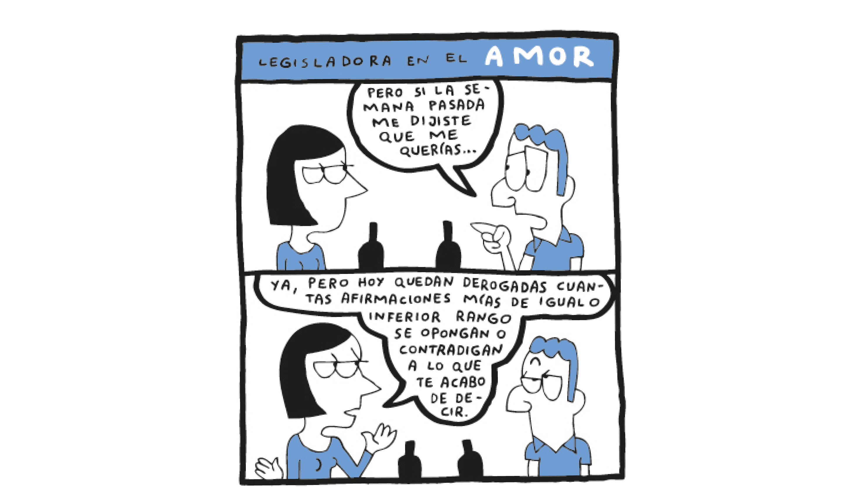 Los dibujos de Mauro Entrialgo para el libro publicado junto a la periodista Eva Belmonte 'Diccionario ilustrado BOE-español. Aprende el idioma que dicta las normas. Y sus recovecos' (ed. Ariel) expresan bien lo que pasa cuando uno se enfrenta al Boletín Oficial del Estado (BOE). Ojos mirando hacia arriba, uno algo más cerrado, ceja enarcada y un remolino sobre la cabeza, como de cortocircuito mental, de estropicio. Ese chico que reclama a su novia: «Pero si la semana pasada dijiste que me querías...». Y ella: «Ya, pero hoy quedan derogadas cuantas afirmaciones mías de igual o inferior rango se opongan o contradigan lo que acabo de decir». ¿Un chiste? No tanto.