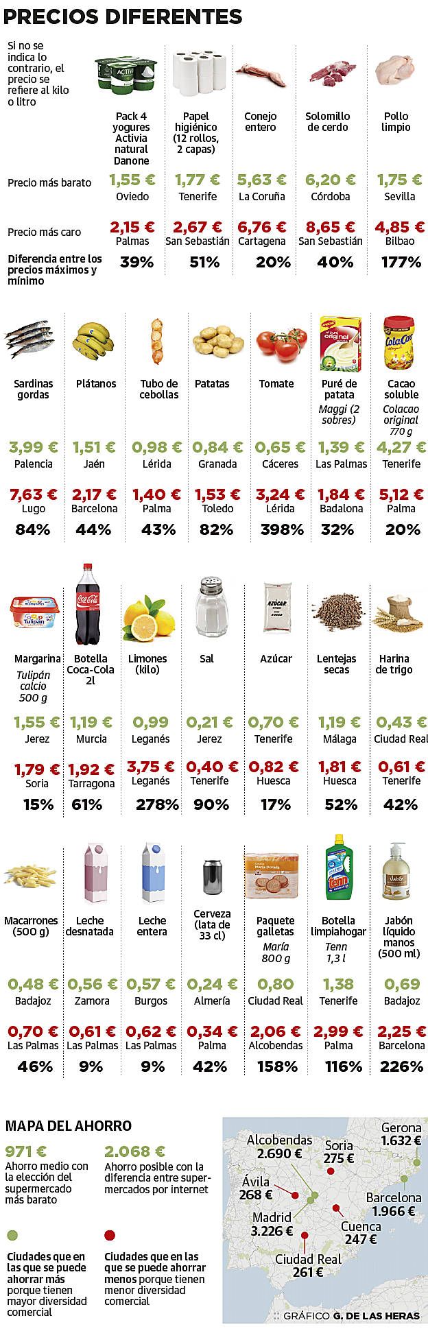 No es una estimación, sino una cuenta exacta. Aquí un ejemplo: Un paquete de medio kilo de macarrones de la misma marca cuesta 0,48 euros en Badajoz y 0,70 en Las Palmas de Gran Canaria. Más: unas galletas de desayuno. En algunos supermercados de Madrid se pueden encontrar por 80 céntimos, mientras que ese mismo paquete de 800 gramos en el municipio madrileño de Alcobendas cuesta 2,08 euros, más del doble.