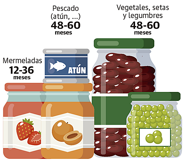 Las conservas son los productos que más duran en nuestra despensa. De ahí que cuando se decretó la cuarentena fueron los primeros que volaron de las estanterías de los supermercados. Al tratarse de alimentos no perecederos –latas de atún, botes de alubias o garbanzos, mermeladas, pimientos, espárragos, cremas de verduras, salsas...– la fecha que los fabricantes imprimen en las etiquetas siempre es de consumo preferente. Es decir, es orientativa y puede oscilar entre los dos meses de las salsas en envases de plástico a los más de cuatro años de los productos envasados en tarros de cristal o en latas. De hecho, no pasa nada por comer unas sardinillas unas semanas o incluso unos meses después de la fecha que aparece en el bote.