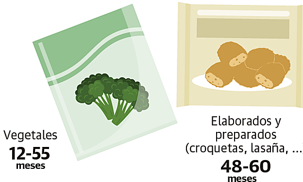 En los congelados la fecha que se indica en el envase también es de consumo preferente. Las bolsas de verduras ultracongeladas de guisantes, judías verdes, zanahorias, patatas... tienen una vida útil –periodo de tiempo durante el cual el producto se puede consumir con todas las garantías sanitarias y nutricionales– de 1 a 4 años. Y los platos preaparados como croquetas o lasaña no superan los 2 años.