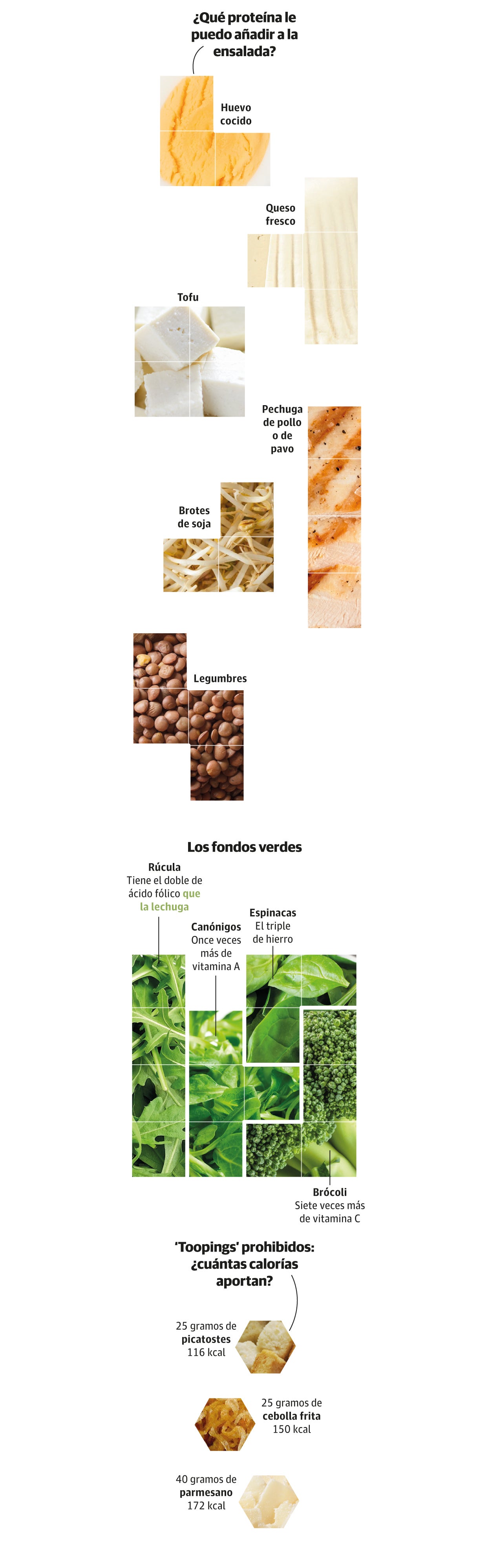 Por cierto que los autores del libro ofrecen alternativas de bases verdes. «Aunque la lechuga es lo más utilizado como base de cualquier ensalada, nutricionalmente no es la opción más interesante: está compuesta de agua casi al 95%, por lo que apenas aporta otros nutrientes. Así que es pobre en proteínas, hidratos de carbono, minerales... y moderada en fibra, lo que la convierte en un alimento muy poco saciante. Por eso, a veces comes una ensalada de lechuga y tomate y al rato quieres atracar la nevera». El brócoli, la rúcula, los canónigos... son otros «fondos verdes más interesantes y ricos».