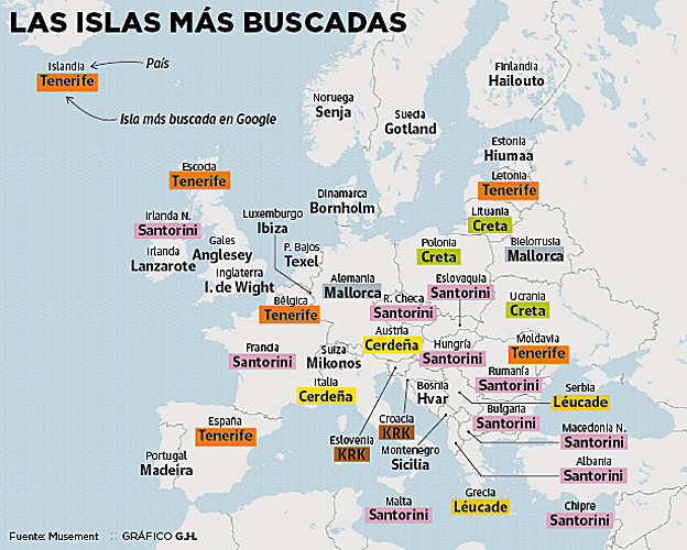 En segunda posición se yergue Tenerife, la isla más buscada, además de en nuestro país, en Bélgica, Islandia, Letonia, Moldavia, y Escocia. Aunque no es la única española que aparece en ese ranking; Mallorca es la preferida de alemanes y bielorrusos, Menorca se sitúa como la favorita en Andorra, Ibiza triunfa en Luxemburgo, y Lanzarote, en Irlanda. En el caso de Tenerife, es rastreada especialmente por sus playas –entre las más deseadas están las de Benijo, La Tejita y la de Punta Blanca– y por el parque nacional del Teide, el parque rural de Anaga y el acantilado de los Gigantes.
