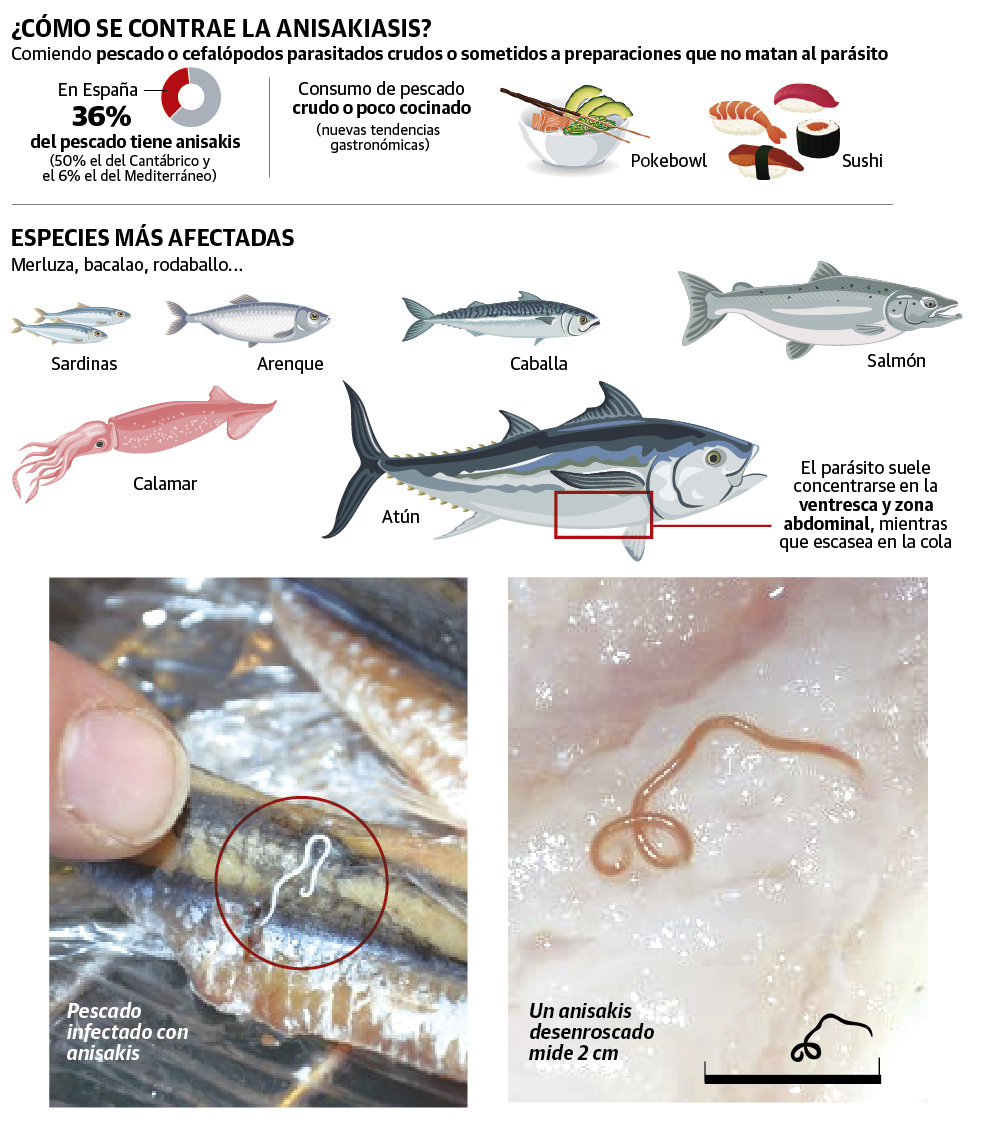 Según los últimos datos, en España, hasta el 36% del pescado tiene anisakis, especialmente el que viene del Cantábrico (50%) y, más raramente, el del Mediterráneo (solo un 6%). Eso sí, no todos implican el mismo riesgo. Los de agua dulce (truchas, percas, carpas...) no tienen anisakis y la prevalencia es mínima en ostras, almejas, berberechos, mejillones y marisco en general, aunque se consuman crudos. Por el contrario, el bacalao, la sardina, el boquerón, el arenque, el salmón, el abadejo, la merluza, la pescadilla, el fletán, el rodaballo, la caballa, el bonito, el jurel, el calamar y la sepia son los más proclives a ingerir el parásito en el mar y llegar parasitados a nuestro plato.