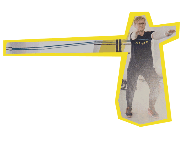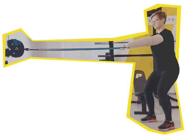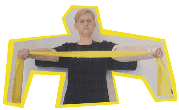 Con los brazos a la altura de los hombros, agarrar la resistencia (goma) y tirar lentamente de ella acercándola al pecho, manteniendo la espalda recta hasta que el elástico toque el pecho. La idea es que juntemos las escápulas.