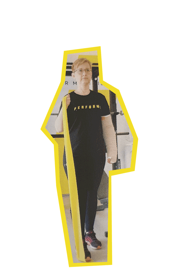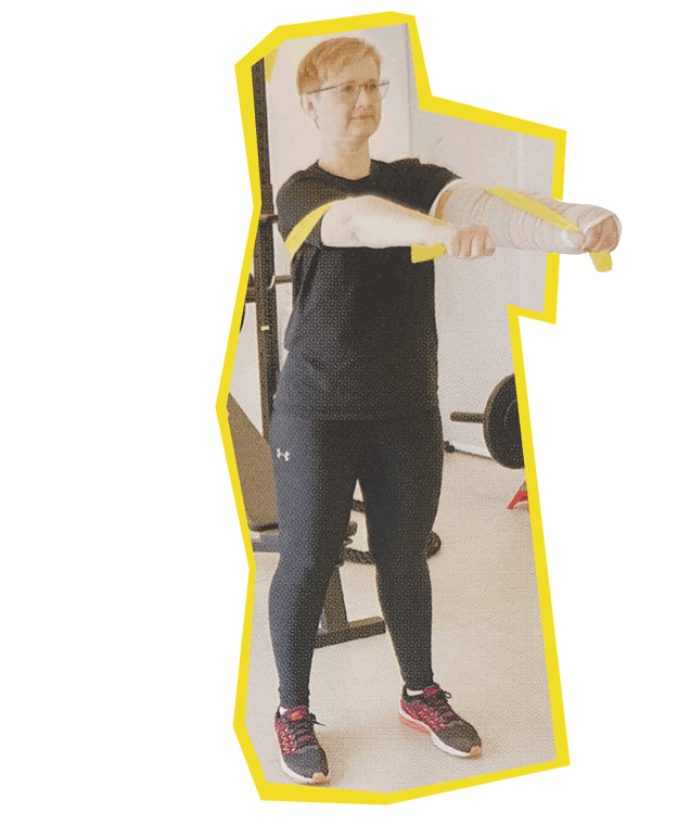 Pisa un extremo de la goma y tira con el brazo de ese mismo lado hacia arriba.
