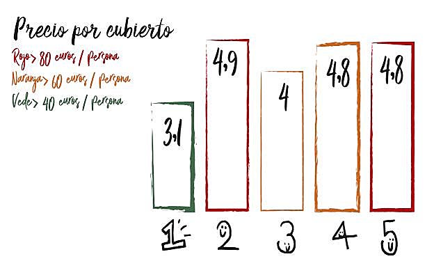 Queremos ir a comer a un sitio chulo, pero dudamos entre cinco restaurantes. Trasladamos la duda a un gráfico de barras donde reflejamos el precio y la puntuación que le dan a cada uno en Tripadvisor. Aunque el restaurante 2 es el mejor valorado parece mejor elección el 4 porque tiene una puntuación solo un poco menor que el 2 pero es más económico».