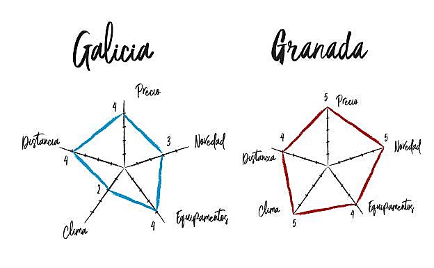 ¿Galicia o Granada? «En este caso un diagrama radial nos puede ayudar. Pensemos en las cinco cuestiones de las que depende nuestra elección, por ejemplo: precio, novedad, distancia, clima e instalaciones para niños. Y puntuemos cada una del 1 (lo peor) al 5 (lo mejor). El dibujo que tenga más pinta de pentágono grande será la elección correcta». Así que... ¡nos vamos a Granada!