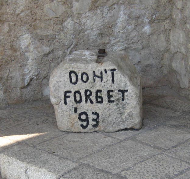 A cada lado del viejo puente recuperado de Mostar, una piedra muestra una inscripción: «No olvides 1993».