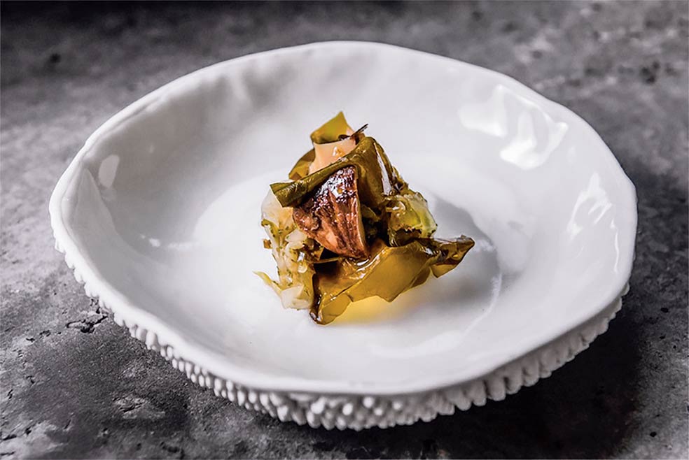 'Donko Shiitake' con chucrut de algas y 'kelp' de azúcar