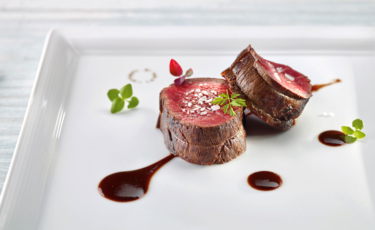 En la misma olla, se sofríen en la mantequilla restante con aceite las chalotas, los ajos, el laurel y las pimientas machacadas en mortero con un poco de harina. Se vierte el vino y se deja reducir con el jugo de la marinada. Se reduce el jugo ligeramente y se deja que espese un poco. Se pican toscamente las hierbas. Se cuela la salsa a un cazo limpio. A la salsa se le añaden hierbas picadas, un poco de aceite crudo, el zumo de limón y la ralladura. Se lleva el solomillo a la mesa sobre una tabla para trincharlo.