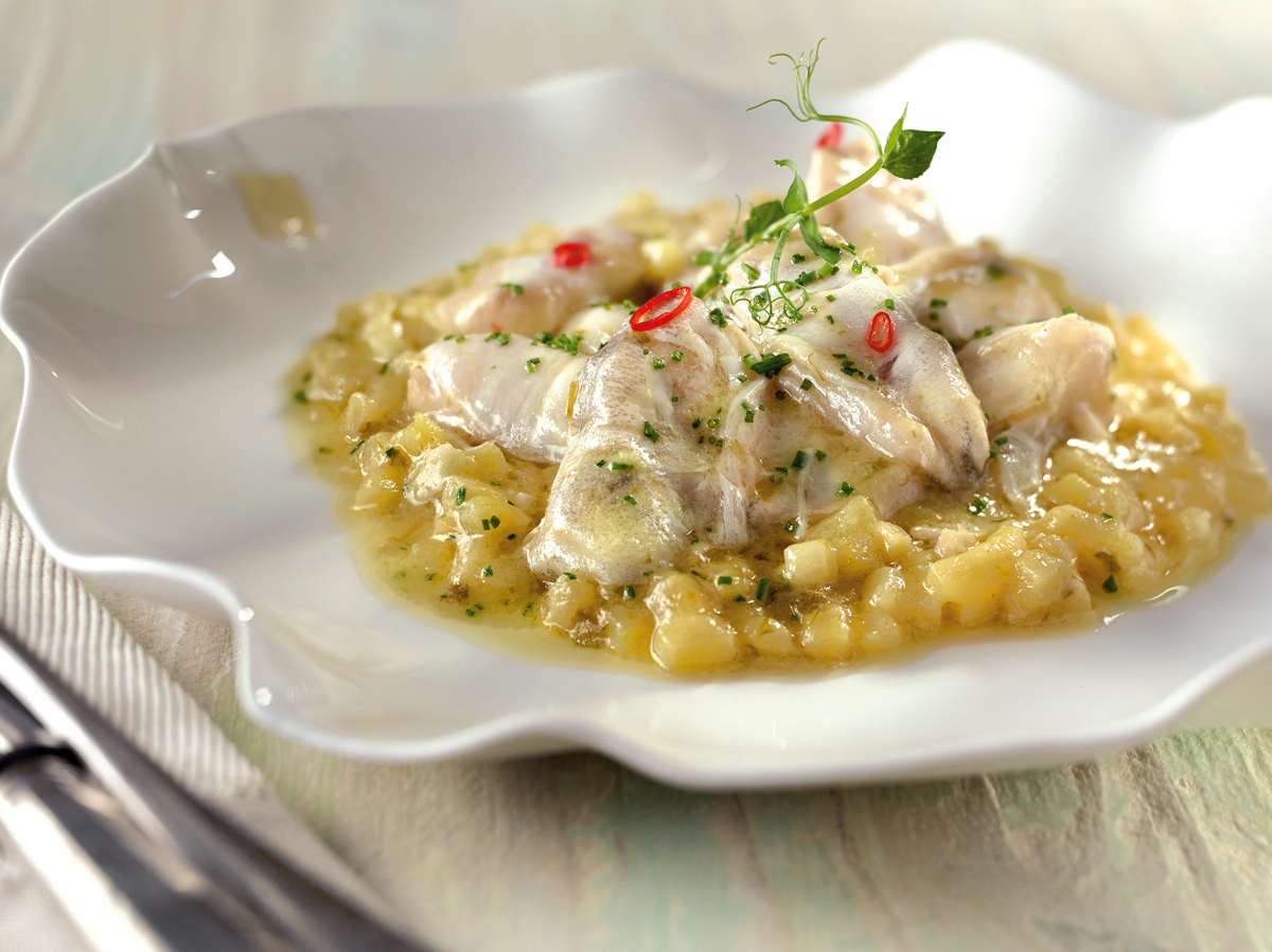 Se añade la patata cortada en dados de 5 mm y se sigue sudando, moviendo el conjunto con cuidado, durante 8 minutos, a fuego lento y tapado, hasta que todo esté hecho... Una vez bien pochadas la verdura y la patata, se agrega la guindilla fresca, sin pepitas. Se echa también el aceite de oliva y, cuando haya tomado temperatura, se colocan encima las cocochas