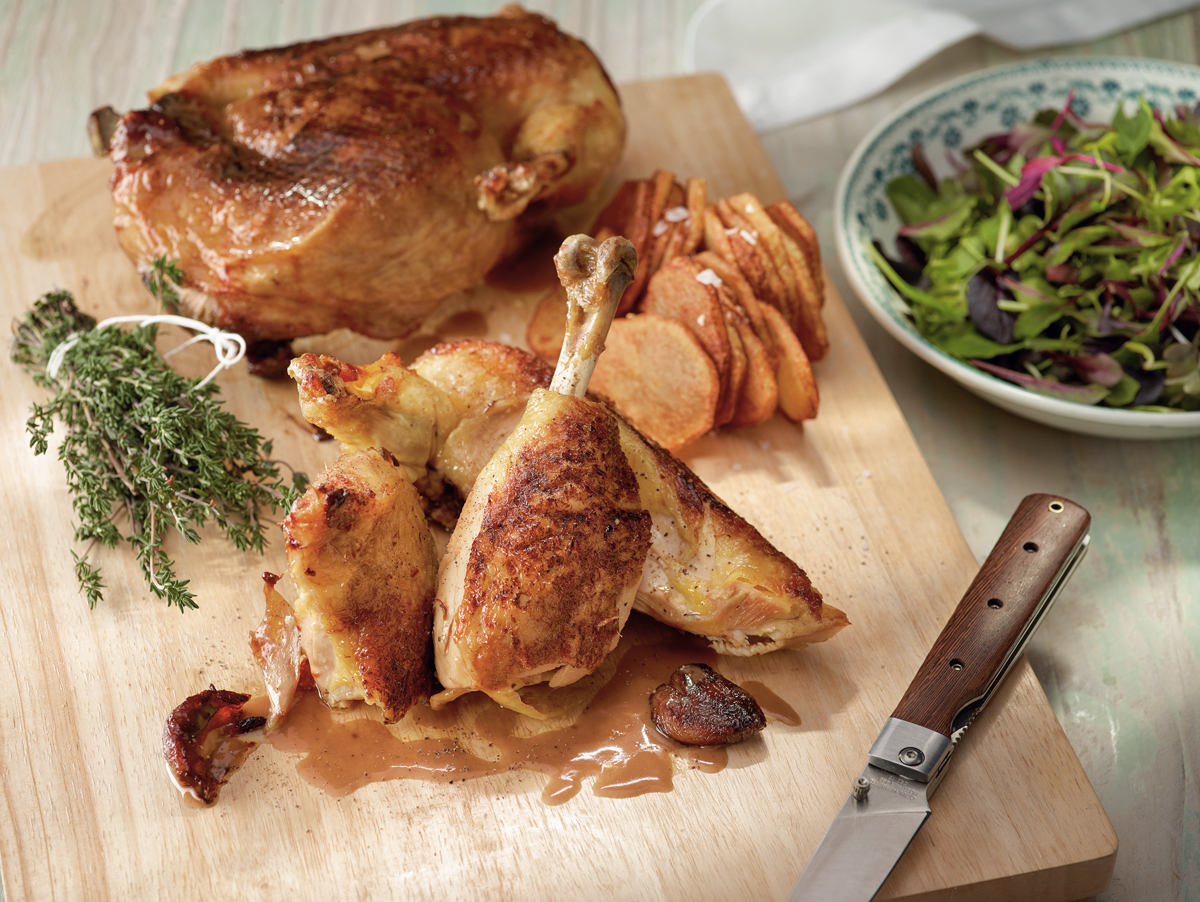Se saca el pollo del horno y se cubre con un papel de aluminio para que repose y los jugos se repartan bien por su interior antes de trinchar la pieza. Se pone la base de salsa que hicimos a fuego suave y, con ayuda de unas varillas, la batimos incorporando el foie- gras, la mantequilla, el brandi y un golpe de pimienta. Se trincha el pollo sobre una tabla y se salpimientan los pedazos. Se adorna con un ramillete de hierbas para darle lustre y se acompaña con la salsa ligada y patatas fritas. ¡Y listo!