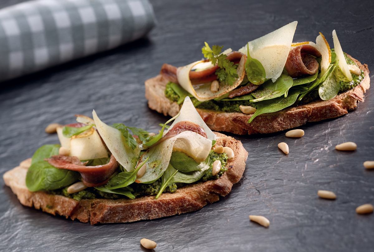 Se hornean las rebanadas de pan en el horno a 180 C durante 5 minutos. En un vaso americano se ponen los piñones, el parmesano y la albahaca, y se trituran rápidamente con la túrmix. Se añade el aceite de oliva y se vuelve a triturar otros 30 segundos, como si hiciésemos una mayonesa. Para evitar la oxidación, se reserva en hielo. Se pela la pera y se lamina finamente con la ayuda de una mandolina. Se hacen unas escamas de queso Idiazábal con un pelador y se reservan. Acabado y presentación. se pone el pan como base y, sobre él se colocan, sucesivamente un poco de pesto de albahaca bien extendido, las hojas de espinaca, las anchoas, el perifollo, las láminas de pera y las escamas de Idiazábal. Se remata con un fino hilo de aceite de oliva.